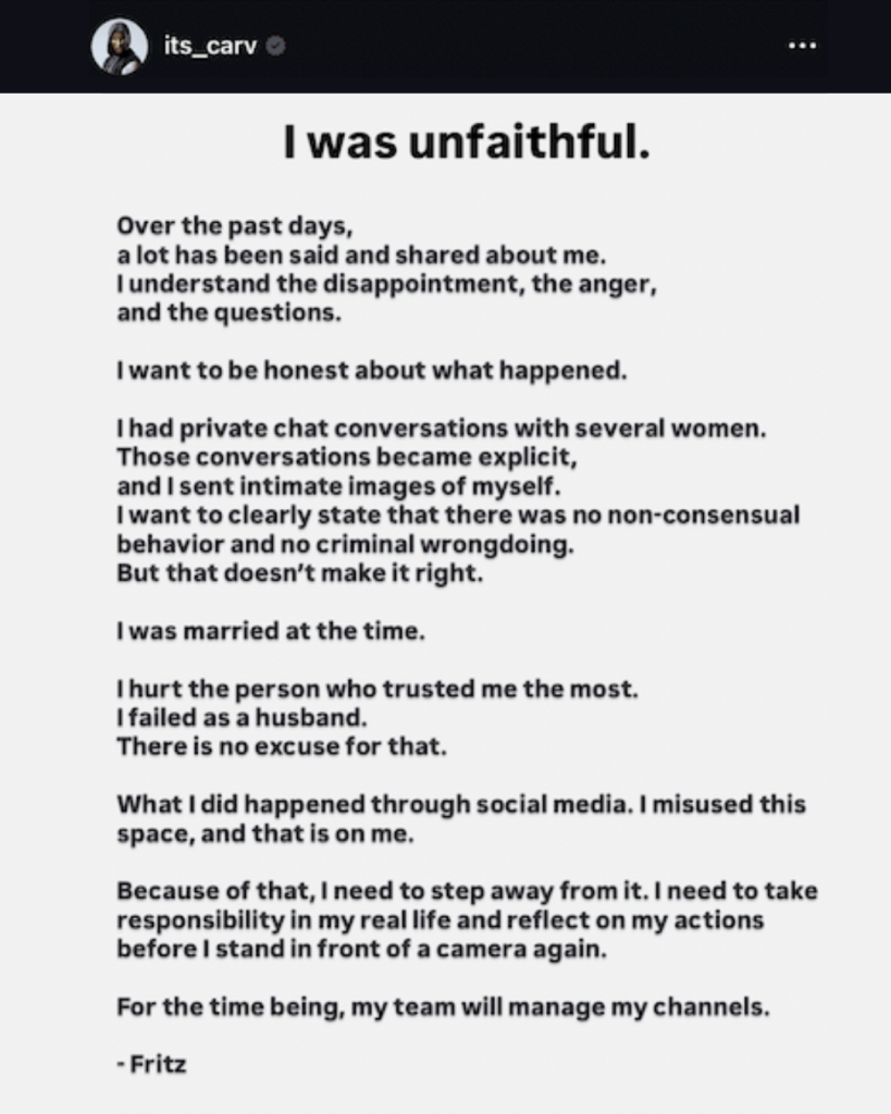 CARV ha publicado comunicado admitiendo infidelidad: chats explícitos con mujeres, imágenes íntimas enviadas, pero insiste en que todo fue consentido y sin delito. Pide perdón a su esposa, dice que fue “mal marido” y se retira temporalmente de redes, sin profundizar en víctimas ni dinámicas de poder.