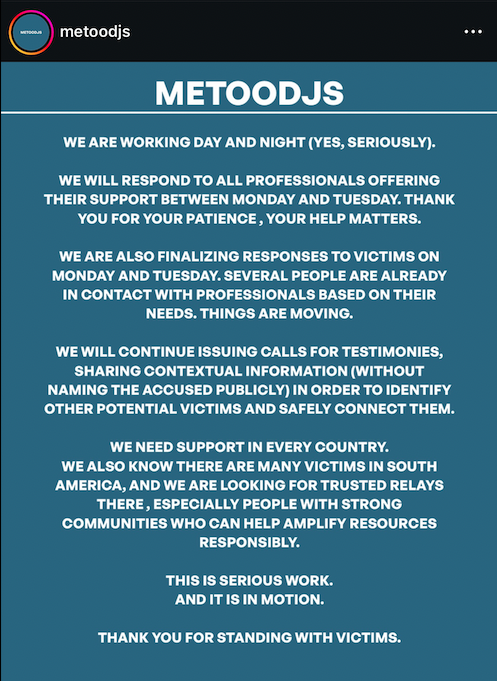 La cuenta @metoodjs da cauce a víctimas, se presenta como altavoz para víctimas y vía de acompañamiento para canalizar denuncias formales contra artistas de la escena electrónica.